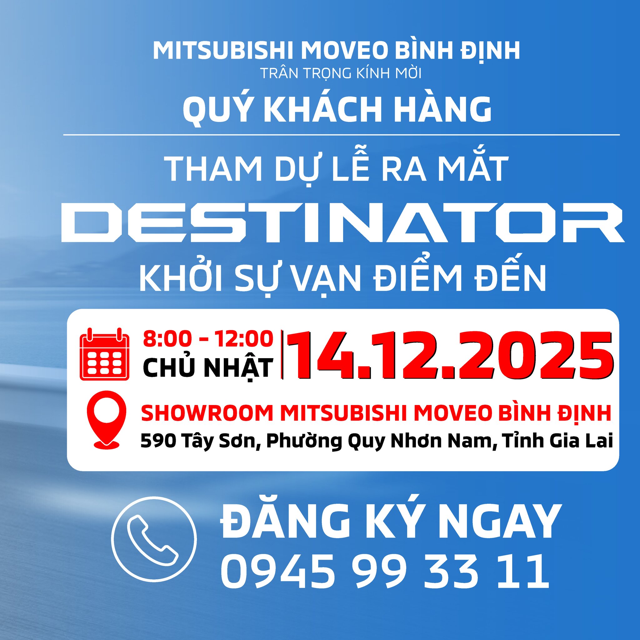 Mitsubishi Moveo Bình Định trân trọng kính mời Quý khách tham dự lễ ra mắt mẫu SUV mới DESTINATOR – biểu tượng cho phong cách sống hiện đại, mạnh mẽ và đầy cảm hứng.